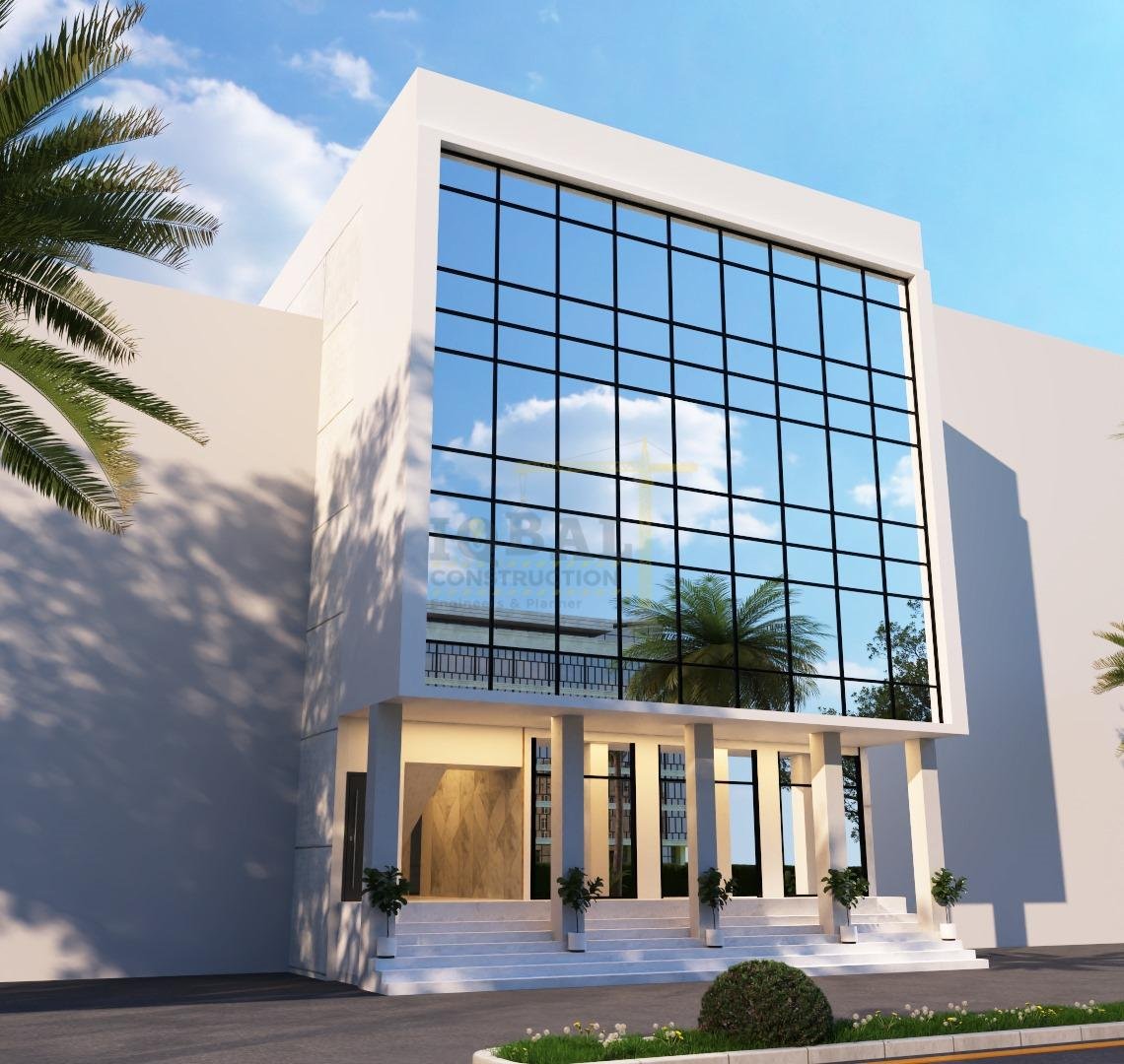 Front elevation features a full glass facade, giving the building a sleek and modern look.