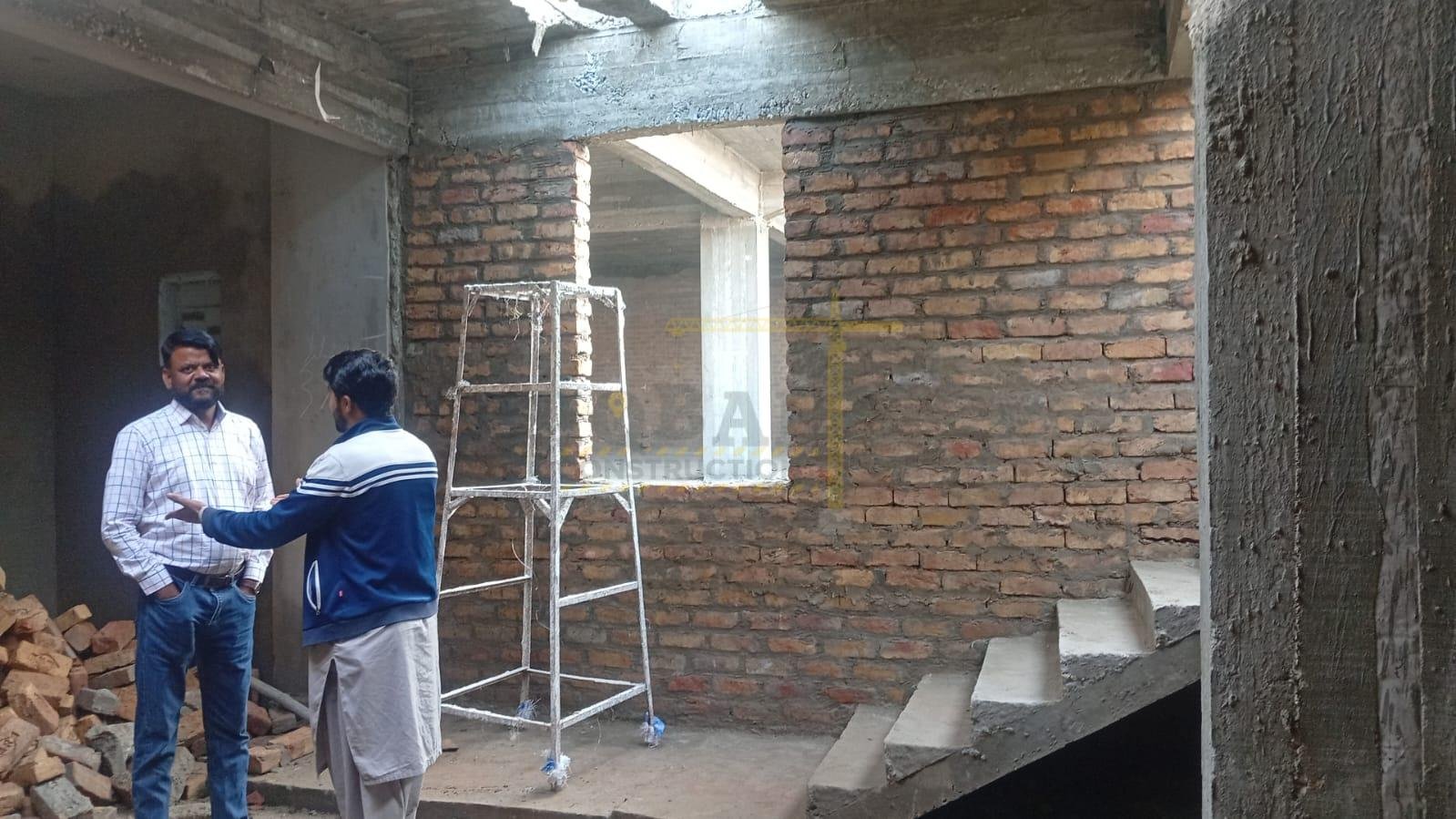 Interior finishing in progress, including plastering, flooring, and painting.